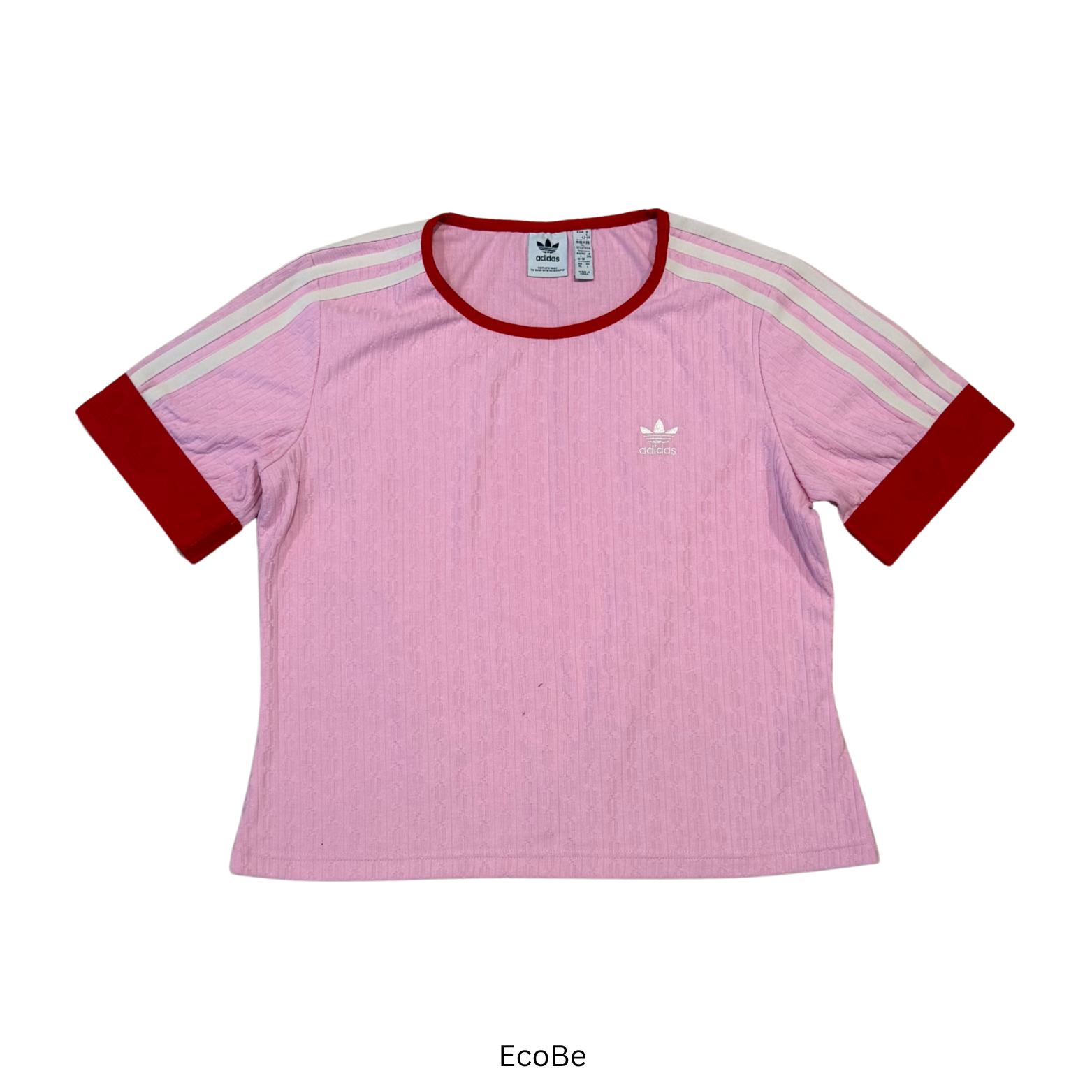 A cropped T-shirt from adidas Originals, featuring the signature 3-Stripes on the shoulders.Designed in a soft pink color with red sleeve cuffs and neckline for a retro-sporty look.Lightweight, comfortable fabric — perfect for casual and athleisure styling.