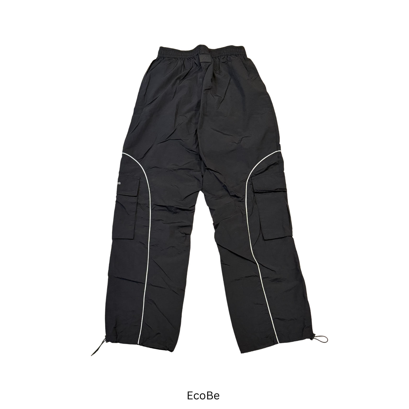 These black cargo track pants feature a bold, sporty design with distinctive reflective piping that adds visibility and a modern edge. Made from lightweight and flexible material, they provide comfort for everyday wear, outdoor activities, or street-style outfits. The multiple cargo pockets offer practical storage, while the adjustable drawcord hems allow you to customize the silhouette to your preference. A versatile and functional piece that pairs easily with hoodies, sweatshirts, or casual tops.